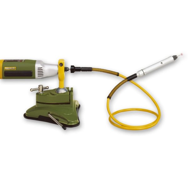 Fitted with a delicate hand piece complete with six steel collets (1.0 – 1.5 – 2.0 – 2.4 – 3.0 and 3.2mm) for accurate holding of rotary tools and collet nut. Suitable for use with any of the PROXXON range of tools or indeed any type of power source that can grip the 3mm male shaft of the unit.